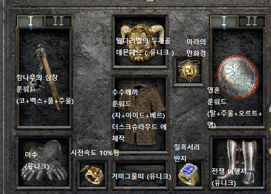 | 1 Tal 룬 + 1 Shael 룬 + 1 퍼펙트 다이아몬드 + 일반 세트 갑옷 | 세트 아머의 뛰어난 버전 |